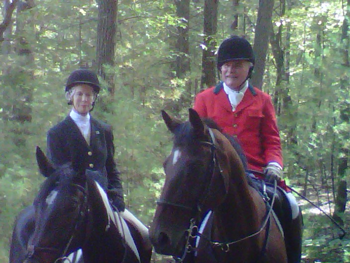 Jenn Fuller adds, “The trusty hound-truck driver was actually mounted for this hunt. Thanks to Rick Arsenault and Susan Goldfisher for manning the truck for the day! We had nine hounds out today, leaving Cameo beind for a few hunts as she’s been trying to tell us that she just wasn’t all that in to it for the last couple of hunts. We’ll give her a break and then bring her back out again soon. It was a spectacular hunt, as far as I’m concerned! We tried some new trails in an oft-visited territory and they were lovely, and bee-free. The field had some great hound viewing as the pack worked hard to find the scent. And Mary Melloni really outdid herself with her contributions to the tea, which unlike our last Tuesday at Arena, was not rained out.”