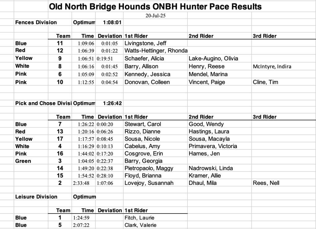 Please join Old North Bridge Hounds for the second Hunter Pace in our series on July 20 at DCR Great Brook Farm State park. This is a fun trail ride where teams of riders follow a pre-marked route collecting hidden poker chips along the course. The team with the best “hand” at the end of the ride wins. There’s no time limit and jumps are optional.