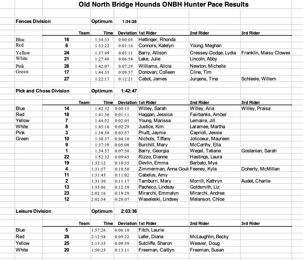 Thank you to everyone who came out for our Hunter Pace and made it such a wonderful day. The results are below. Ribbons will be mailed out soon.